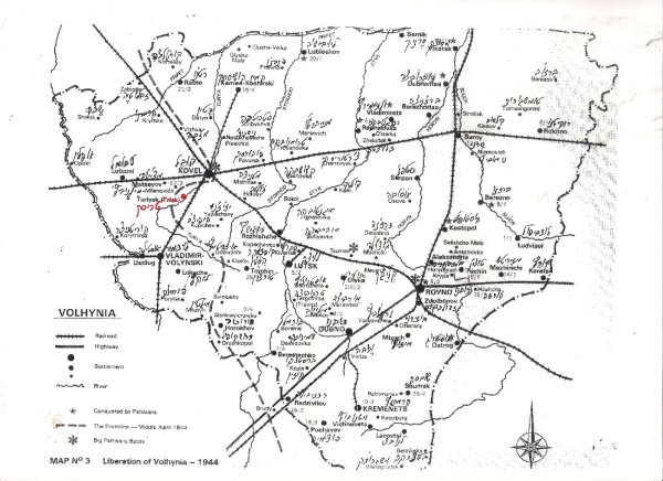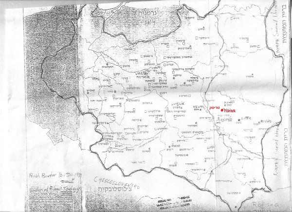 Turisk was founded by Jews in 1094, on the shores of the river Turia. The Jewish residents dealt with rooting out the forests, and wood industry. The community grew. A jewish cemetery of the 12th century was discovered near Turisk. The Shtetl was occupied six times by neighbour countries. Parts of it was destroyed, the Jews always recovered and started new. In the 16th century the community flourished. They build a very big synagogue. Then new oppressions were imposed. The Jewish population was forbidden to live or act in the cities of the country. The oppressions caused an economical crisis to to region. Turisk suffered, and was fighting to survive. The suffering caused dreams and expectations the Messeyash to arrive… In the beginning of the 18th century, the Hassidic movement flourished. The rebe Avraham Tversky, the son of the Maggyd from Chernobyl decided to settle in Turisk. He started the the Trisker Hassidic dynsty. A very big court was build, and it brought a dramatic change to the economic situation. Hassidim from all over Poland, Ukraina visited the Maggyd, to get His blessings. Rebe Avremele Maggyd was a very well known commentator of the Torah, in the 80tees He published His study "Magen Avraham", which is a study book in the yeshivot until today. In the beginning of the 19th century the spirits of the Haskala penetrated into the circles of the yeshiva students, when Coming home they erected Zionist groups, and modernization of the Cheiders. A library was foundet, they collected books from the members homes, most of them in Yiddish. A Jewish school was foundet wih Hebrew and yiddish as teaching languages. It aroused a very strong reaction of the Orthodox Hassidim,but the progress continued. In the first world war the German army occupaied Turisk. The Shtetl was closed and isolated, the economy collapced, starvation and hunger. The Rebe with all the court left for Russia. When the war was over a group of Zionist school teachers decided to join the "Tarbut" school net,and stopped to teach Yiddish. As a result a group of Yiddish teachers lead by the writer Leib Olizky foundet a school with Yiddish as the teaching language. It devided the Shtetl into two camps of Zionits and Bundists. The first "Hashomer" was foundet and the first group of youngsters immigrated to Palestine. When they left the "Ahaluz—Pioneer" organization arouse and young Zionists man and women went to "Hachshara" places to prepare for Palestine. That was "KLOSOVA" a stone quarry, hard and dangerous work. An Hachshara place started in a sawmill not far from Turisk. Tens of yong Hallouzim from other Shtetlach were preparing for Palestine. It influenced the youth. In 1927 the Hashomer Hazair youth movement erected a "NEST" jn Turisk . The founders were students of the "Tarbut" high school in Kovel, and included the pupils of the Tarbut school. The grown up members left for the Hachshara center, Bialystock, and then started to leave for Palestine. The slogan of the movement was self fulfillment, to be a peasent in Palestine. One of the founders was Yeshaayahu (shayke) Wainer, he went for Hachshara then was enlisted to be one of the leaders of the unlegal immigration to Palestine. He became one of the leading groupe of Hashomer Hazahir in Poland. In 1939 was elected to be the delegate of the movement to the Zionist Congress in Basel. The Yiddish school was the first of its kind in all the region of 44 towns and Shtetlach. It became famous because of the level of its education. In time many of their graduates became writers and poets in Yiddish literature. The competition betweenthe parties was a trigger to culturally enrich the Shtetl. Turisk became famous because of several important personalities and events: